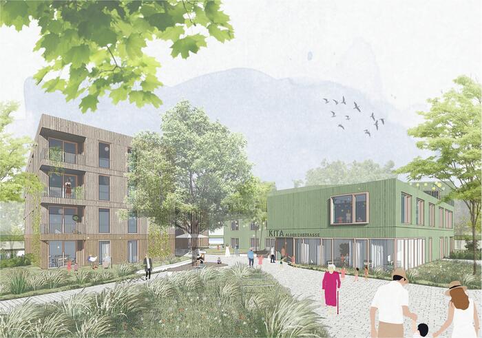 Das Bauvorhaben besteht aus zwei L-förmigen Gebäudeteilen für Wohnen und Kita. Ein gemeinsamer Innenhof sowie offen gestaltete Eingangsbereiche fördern Begegnungen zwischen den Generationen. Gleichzeitig sorgen klar getrennte Bereiche für Rückzug, Sicherheit und geschützte Spielräume. Das Projekt erfüllt hohe ökologische Standards, unter anderem durch Dach- und Fassadenbegrünung sowie die Nutzung erneuerbarer Energien.